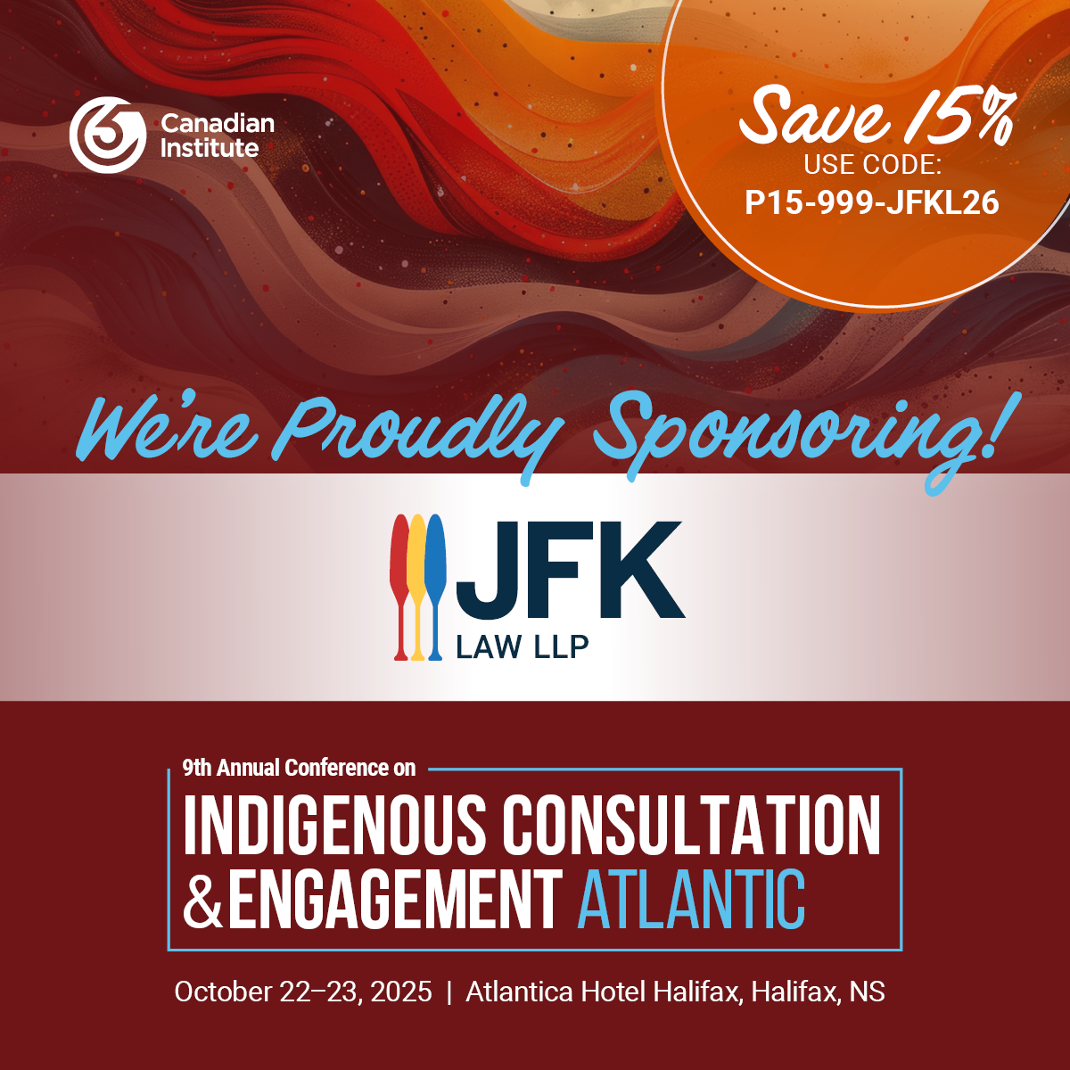 JFK Law is thrilled to be sponsoring CI’s 9th Annual Conference on Indigenous Consultation & Engagement Atlantic. This forum is an important opportunity for rights holders and stakeholders to come together to collaboratively navigate the evolving duty to consult and strengthen sustainable development in the Atlantic. On Day 1, JFK’s Robert Janes will be speaking on Kebaowek and the Rise of Free, Prior and Informed Consent: What This Ruling Means for the Duty to Consult and on Day 2, JFK’s Nadir André will be co-presenting on Navigating Cumulative Effects: Holistic Approaches Informed by Law, Policy, and Indigenous Knowledge.